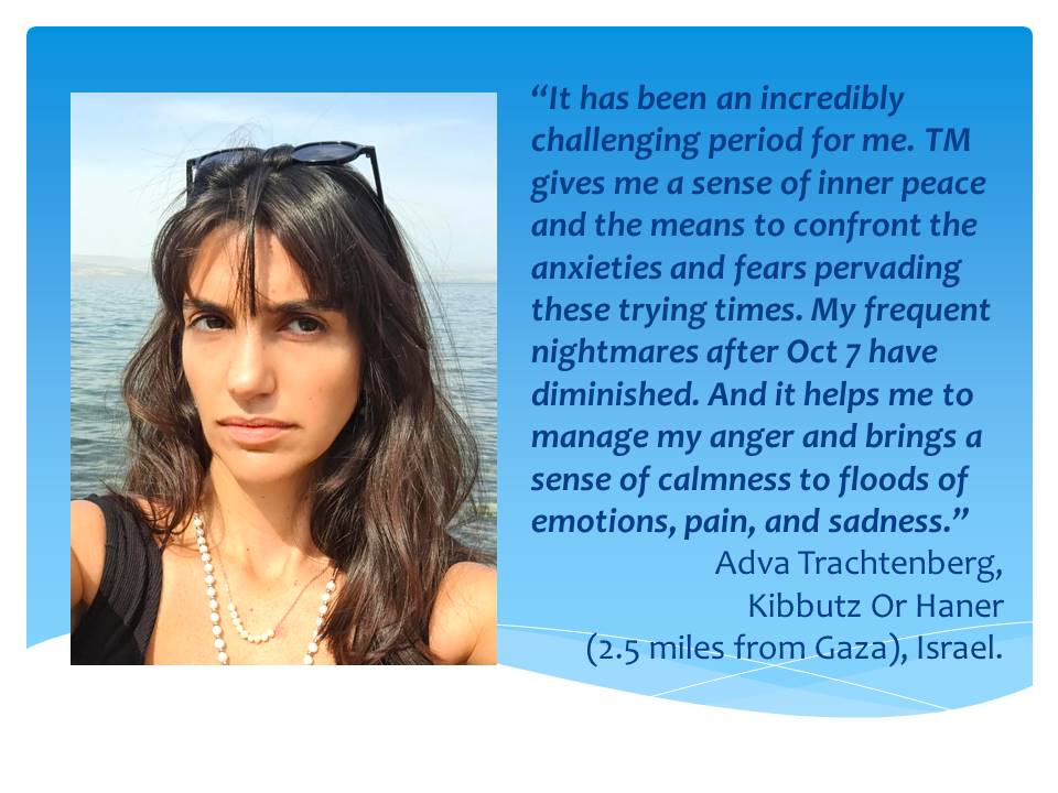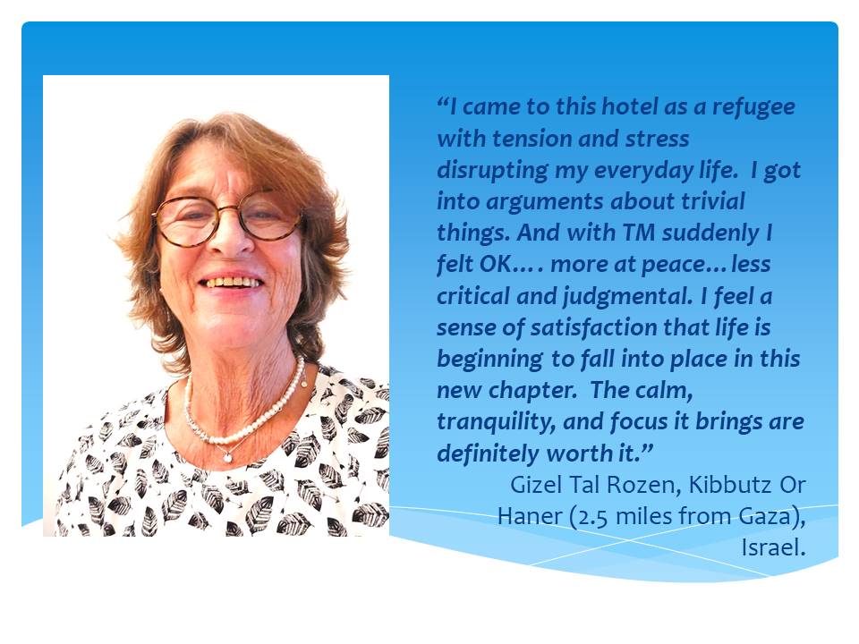Right now, the Israeli TM program movement has a waiting list of people displaced by the war who need scholarships to learn the TM technique, and more are signing up every day.
