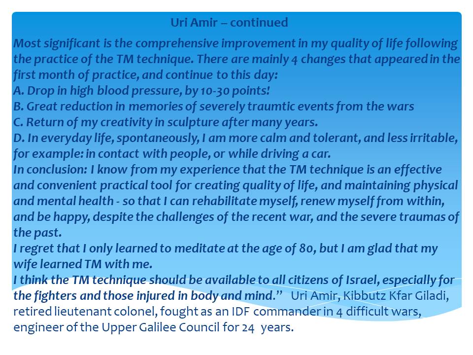 Many Israelis who are learning the TM technique have agreed to be part of a new PTSD research project to document the reduction in PTSD with the TM practice. This study will demonstrate how potent and reliable the TM program is at reducing PTSD in the Middle East.